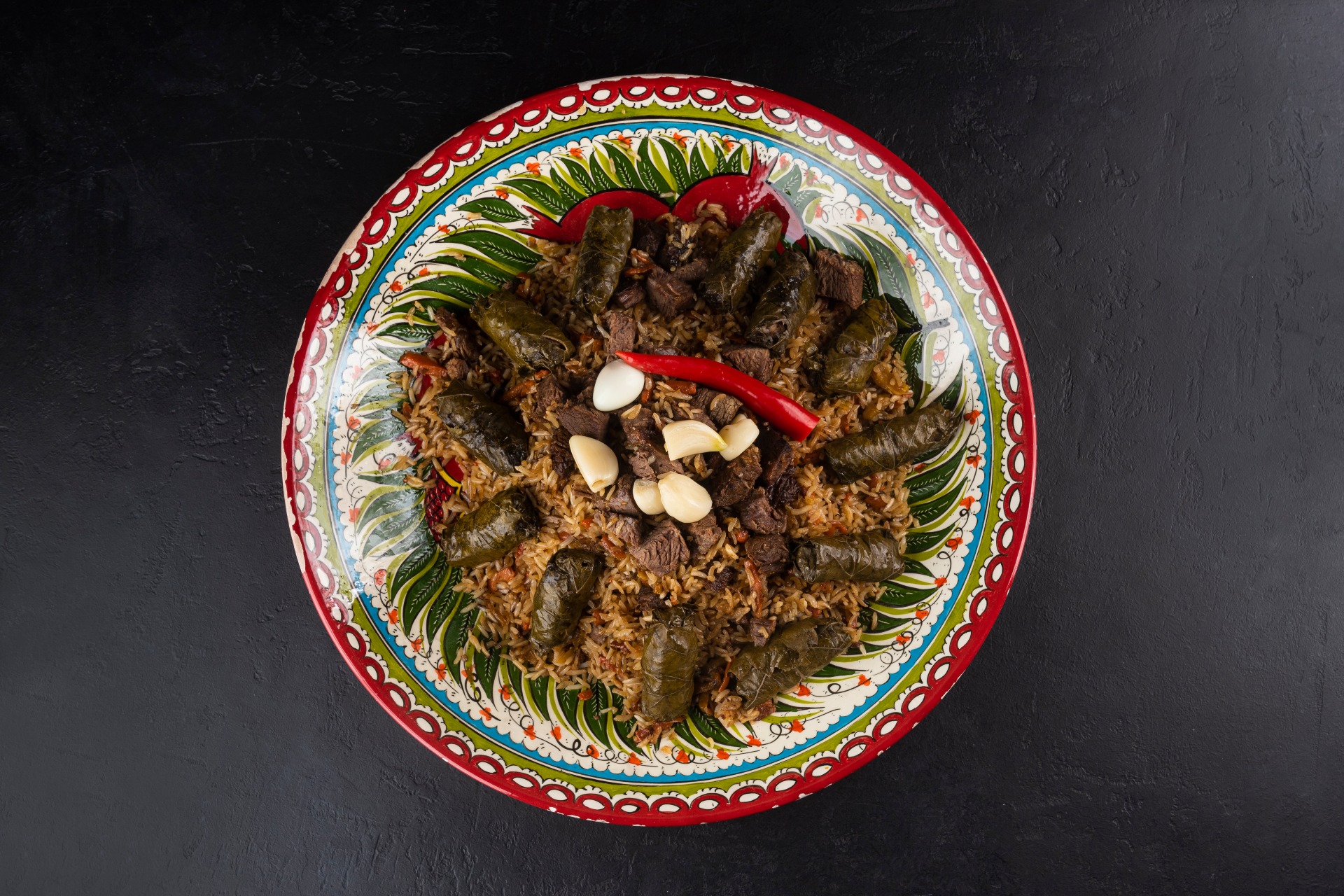 Uzbek pilaf prepared according to an ancient recipe in a cast‑iron kazan, made with Lazer rice and tender veal, enriched with yellow and red carrots, onions, barberries, and cumin. It is served with dolma, chili pepper, garlic, and a quail egg.