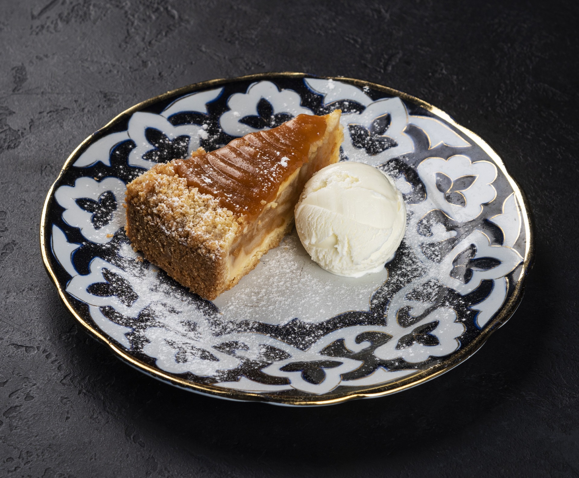 Apple pie with juicy apple filling. Served with a scoop of vanilla ice cream.