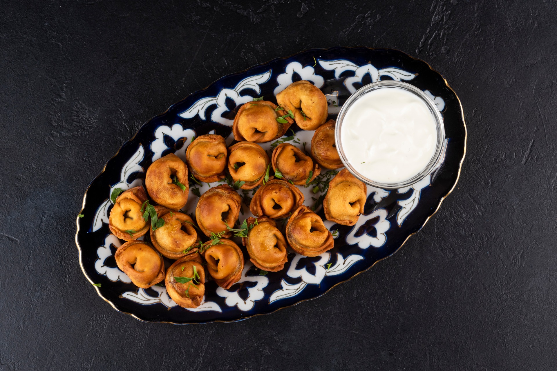 Fried handmade pelmeni stuffed with lamb and onion, made according to an Eastern recipe. Served with sour cream and garnished with aromatic herbs.