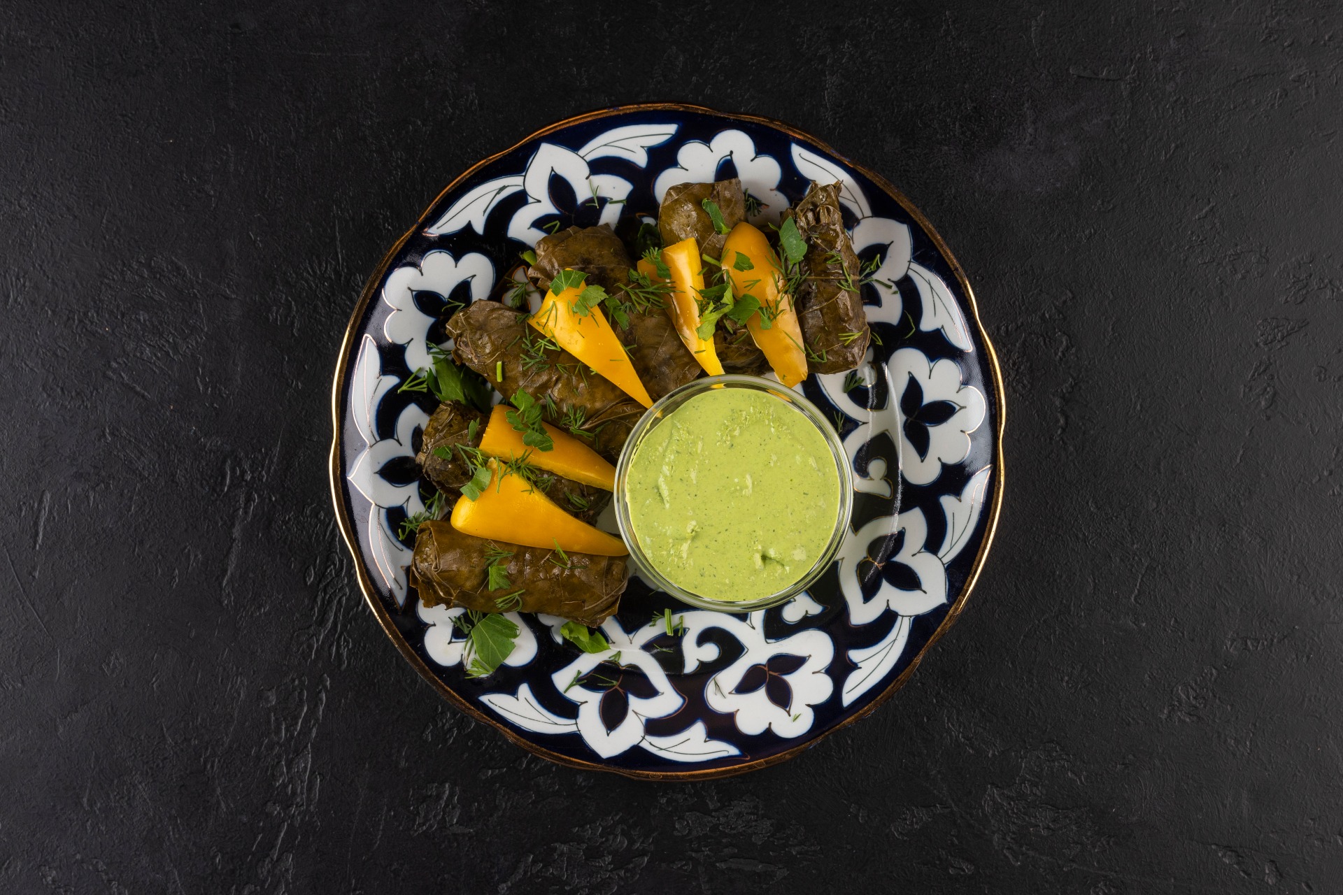 Pickled grape leaves stuffed with minced lamb, onion, rice, and oriental spices. The dish is served with sweet peppers and Tchahtone sauce, sprinkled with fresh herbs.