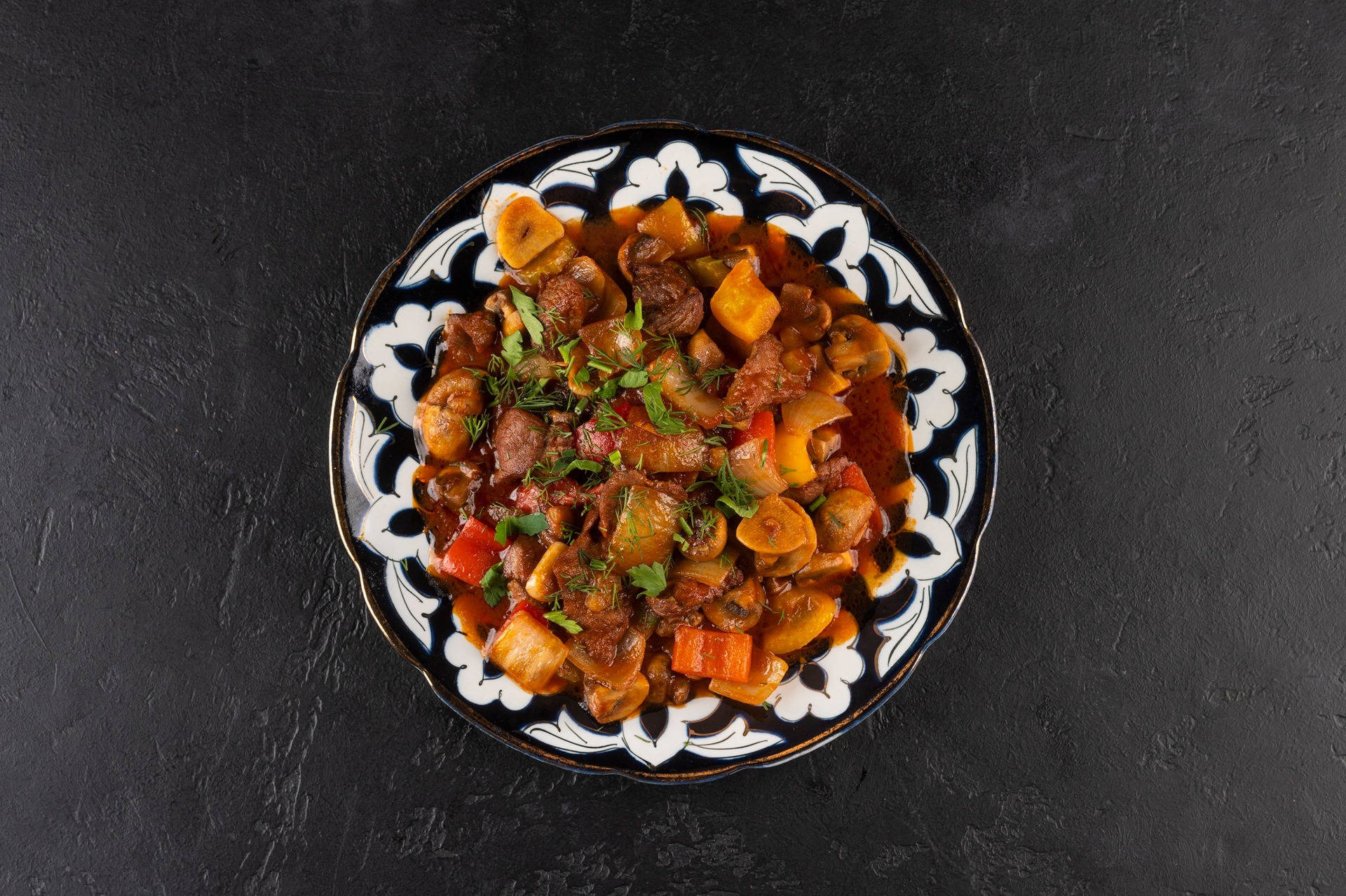 Flambéed in tomato and soy sauce, appetizing pieces of lamb with mushrooms, bell pepper, celery, Chinese cabbage, onion, garlic, and oriental spices. The dish is topped with fragrant herbs.