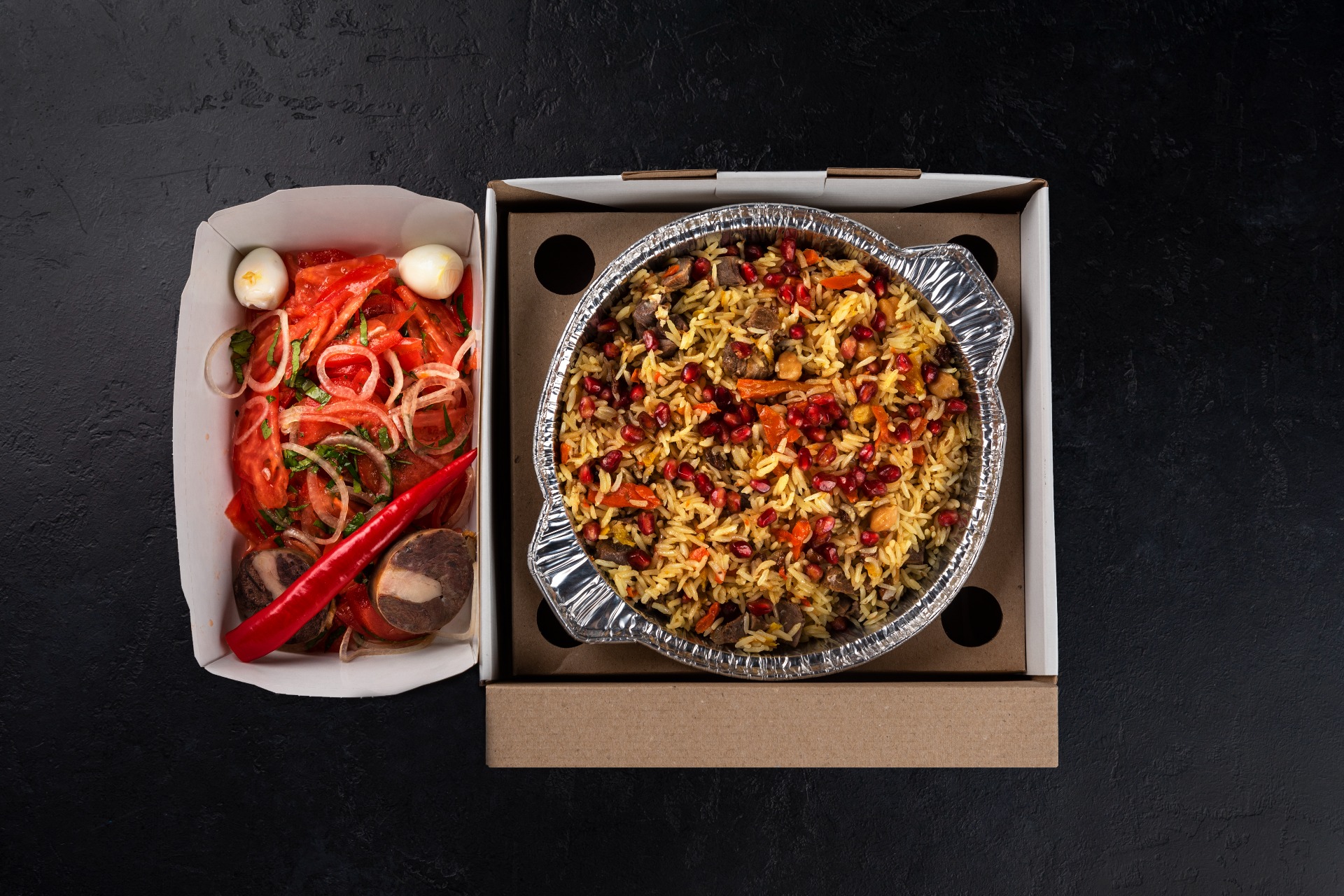 Festive pilaf made according to the classic recipe in a cast‑iron kazan, featuring meat of a young fat‑tailed lamb and Laser rice, with added yellow and red carrots, chickpeas, raisins, and cumin. It is garnished with pomegranate seeds. The pilaf is served with Uzbek kazy, quail eggs, Achik‑Chuchuk salad, and spicy chili peppers. It is delivered in a kazan, which keeps the pilaf hot for an extended period of time.