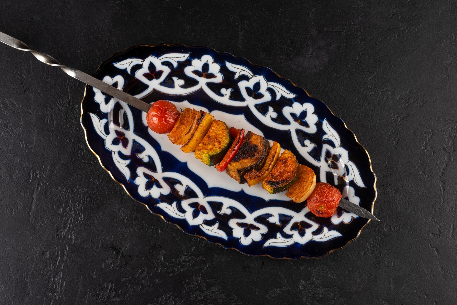 Shashlik made from slices of eggplant, zucchini, cherry tomatoes, sweet bell pepper, and onion.