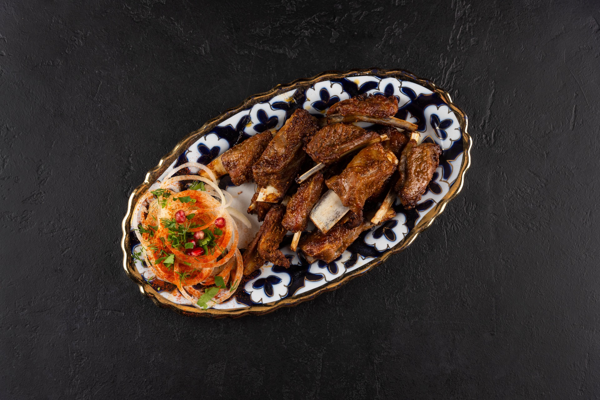Pieces of lamb ribs grilled on the grill until a crispy crust forms. The dish is served with marinated onions, pomegranate greens.