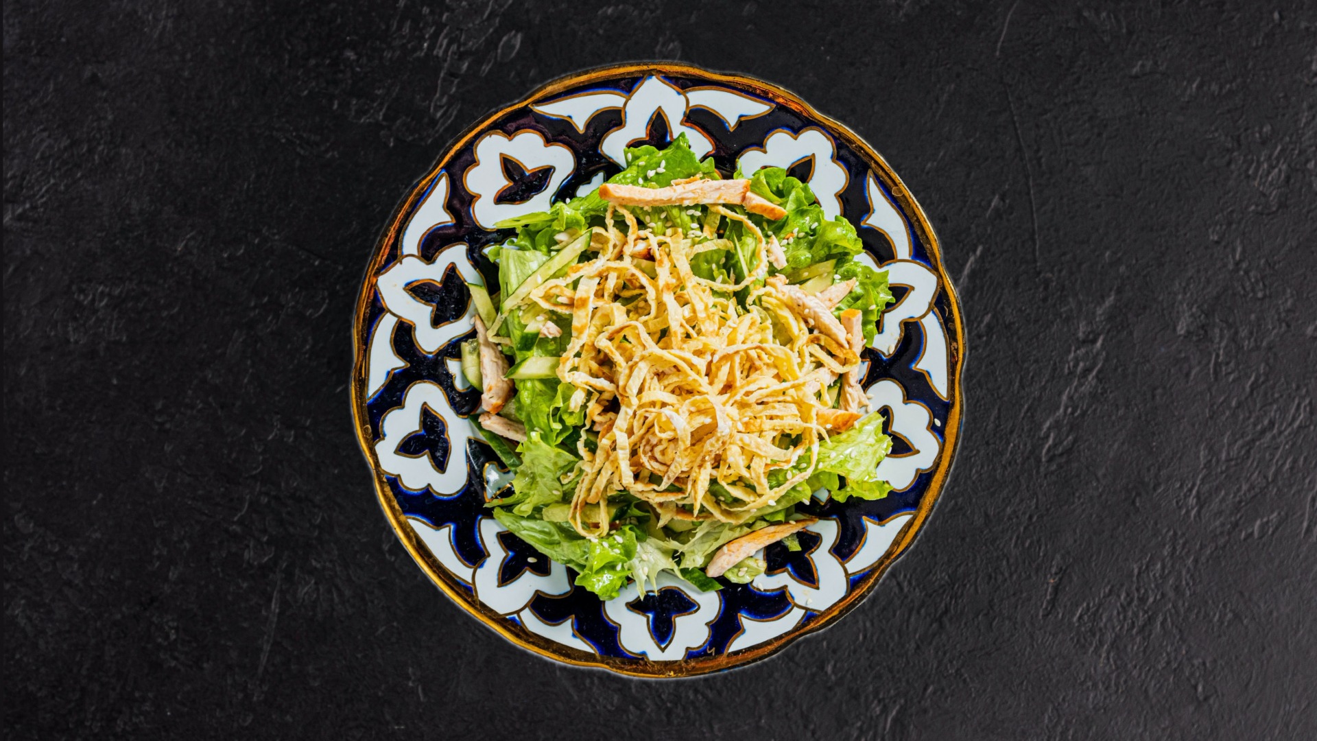 Salad of baked chicken fillet, fresh cucumber, omelette, and iceberg and Lola lettuce leaves. Dressed with vegetable oil and sprinkled with sesame seeds.