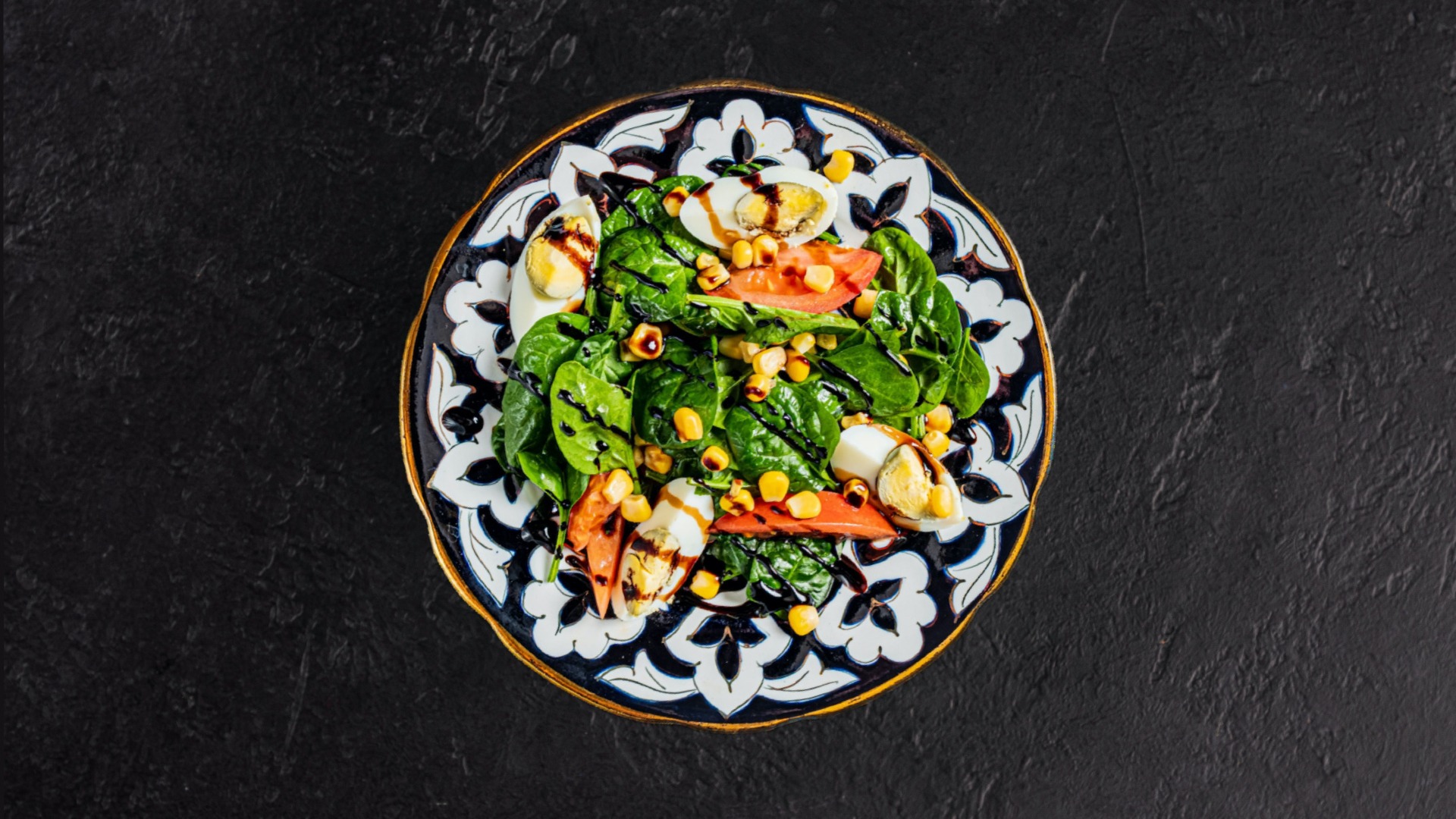 Salad of juicy spinach leaves, tomatoes, corn, and slices of boiled egg. Dressed with vegetable oil and cream‑balsamic.