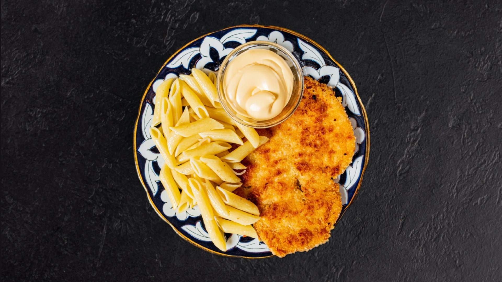 Chicken cutlet in crispy Panko breading, served with a side of penne and cheese sauce.