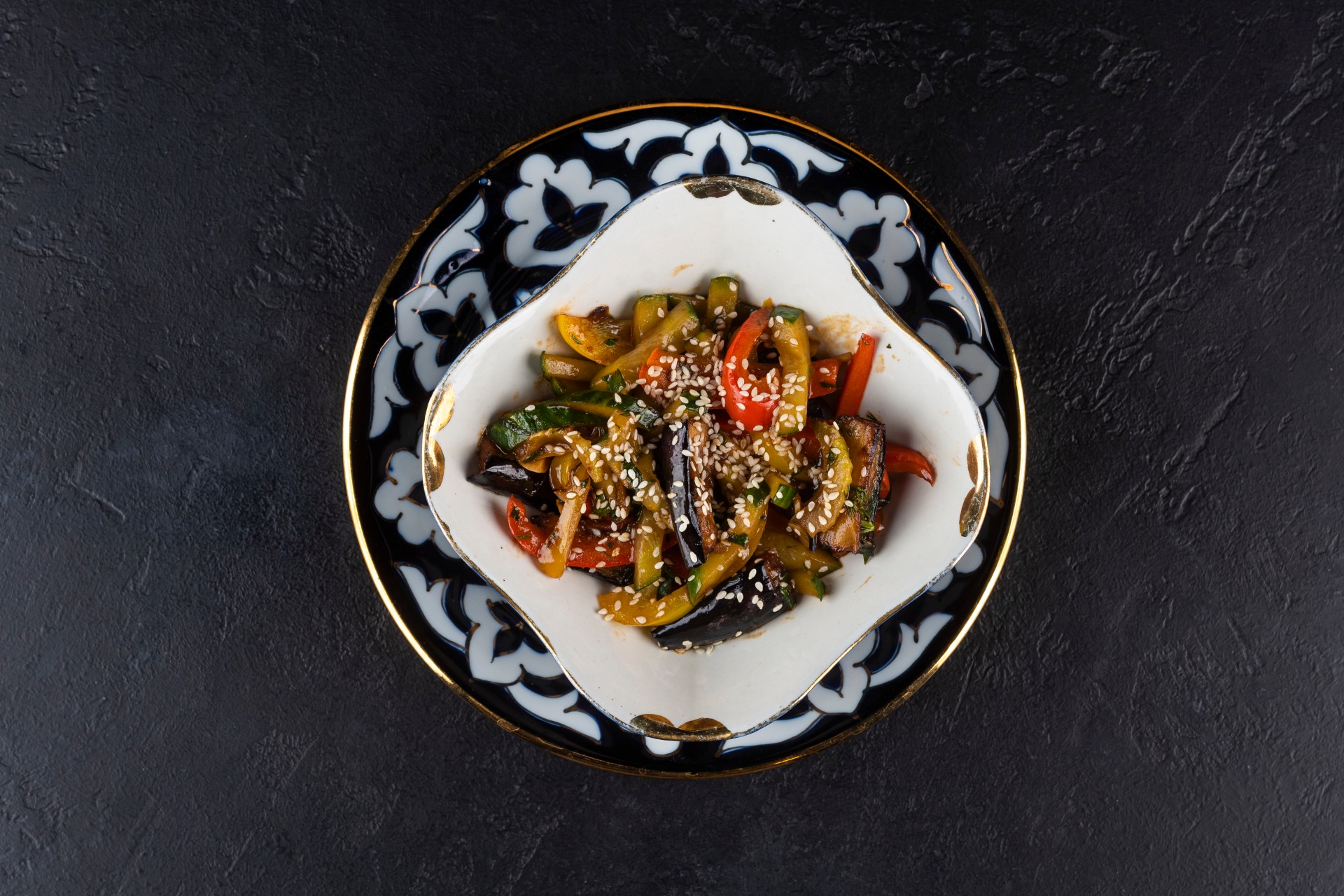 Warm salad of roasted vegetables: eggplant, sweet pepper, cucumber, and garlic. The salad is dressed with soy sauce, sprinkled with fragrant herbs and sesame.