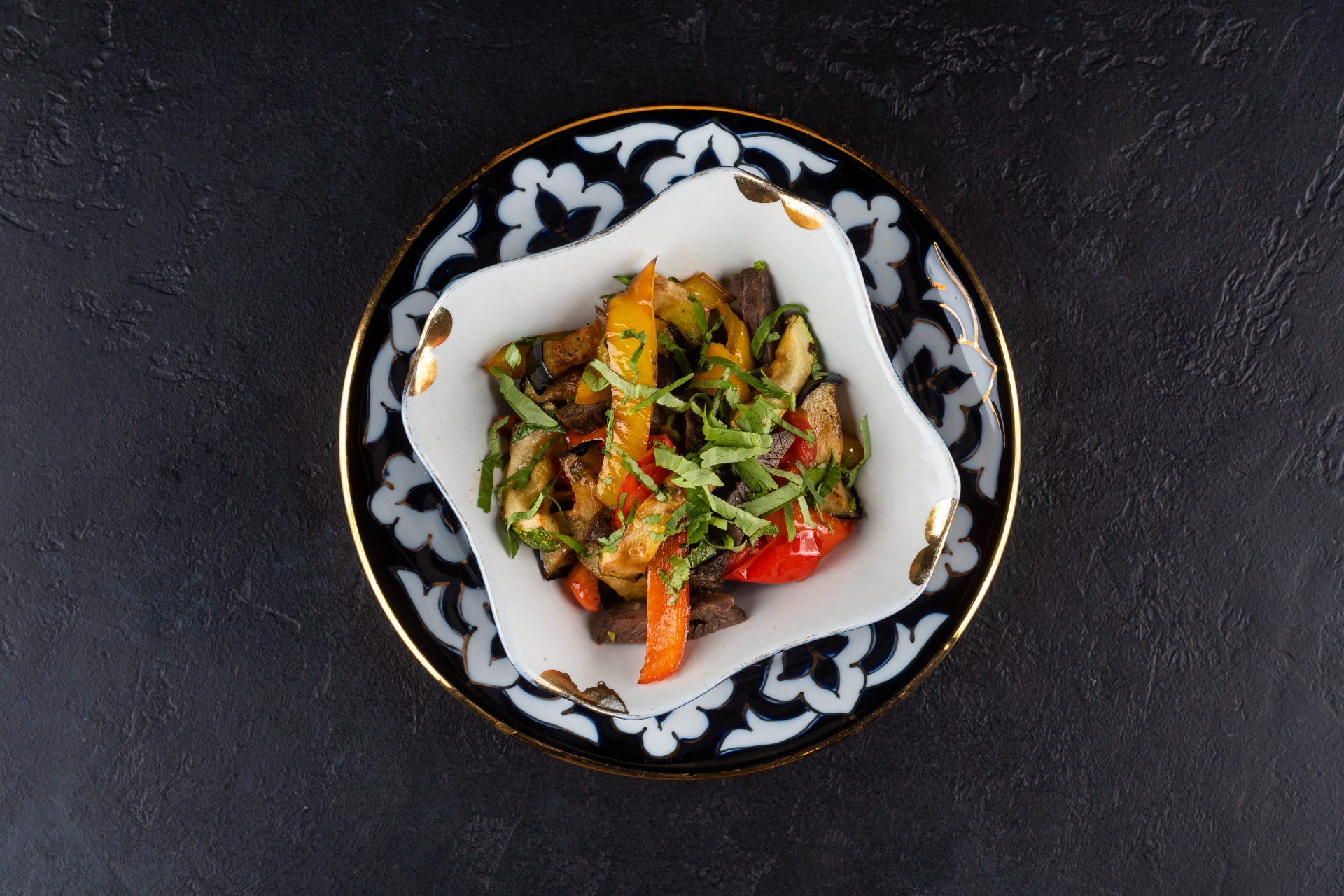Warm salad of sautéed veal, eggplant, zucchini, roasted sweet pepper and tomatoes with garlic and cilantro.