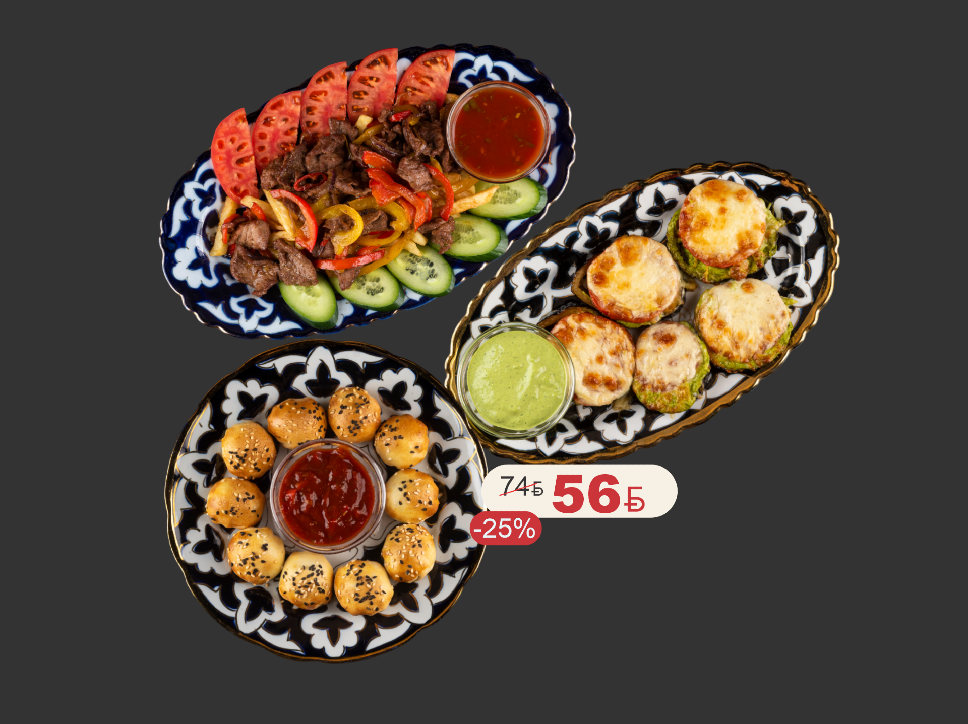 телятина, картофель фри, свежие овощи, шашлычный соус