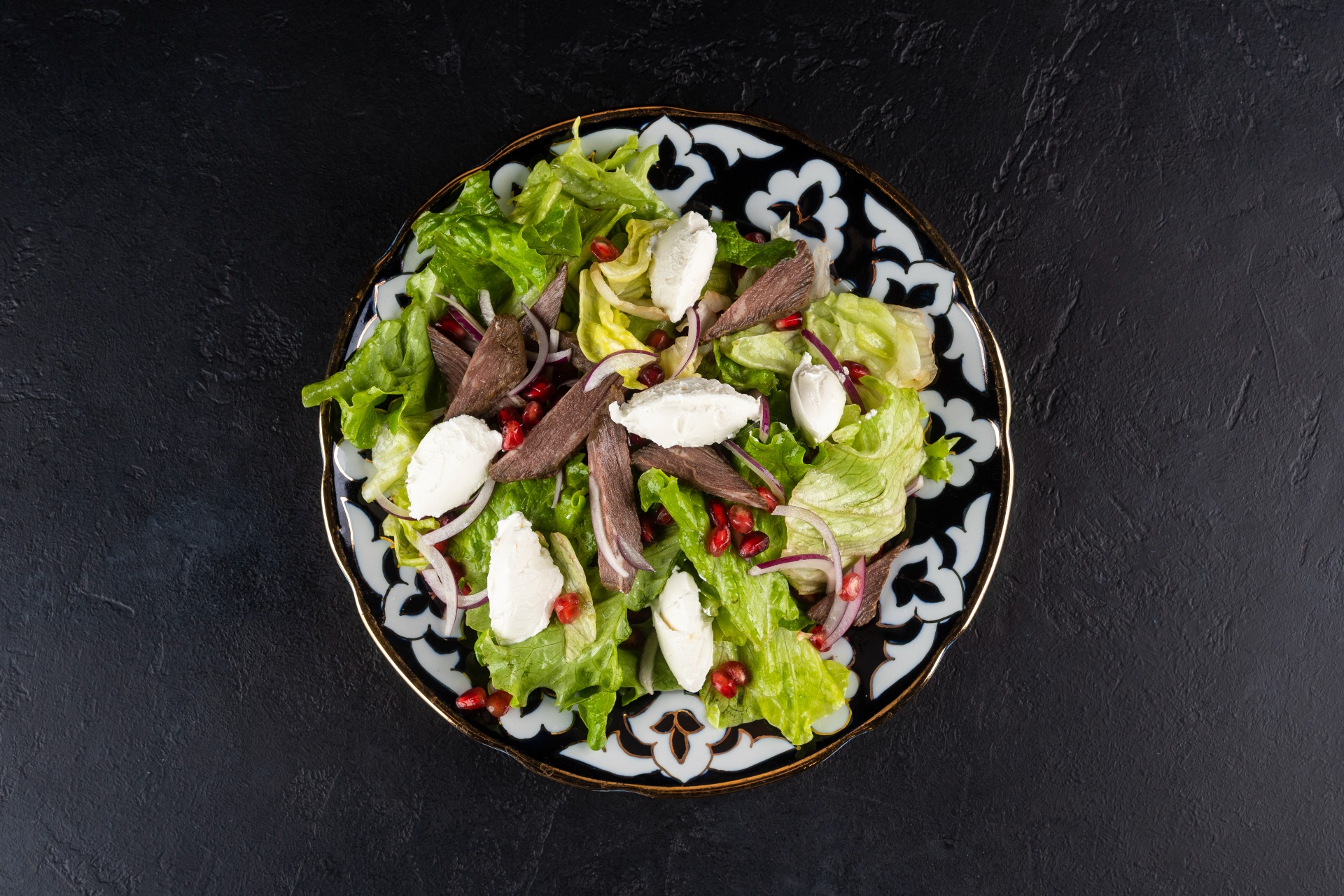 Salad with tender roast beef, cream cheese, red onion, juicy pomegranate seeds, iceberg lettuce leaves and Lola, and signature dressing.