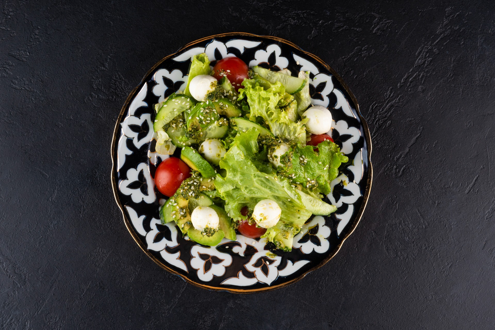 Light salad of ripe avocado, crunchy cucumber, cherry tomatoes, mini mozzarella, iceberg lettuce leaves, and Lola, served with pesto sauce.