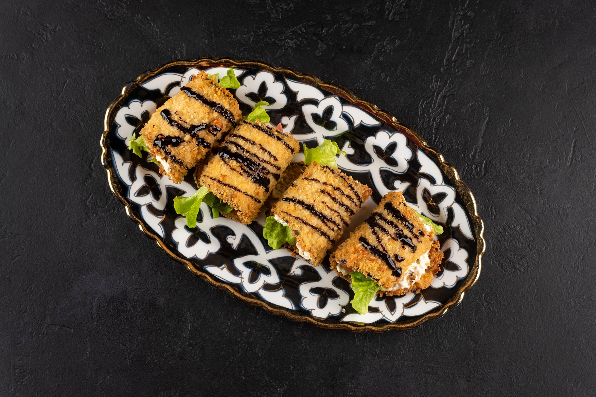 Our eggplant tempura is not just fried, it’s true art. Inside each roll is a filling of fresh lettuce leaves, crunchy cucumber, and pink soy tomato. This blend of vivid colors and freshness shines in every bite.