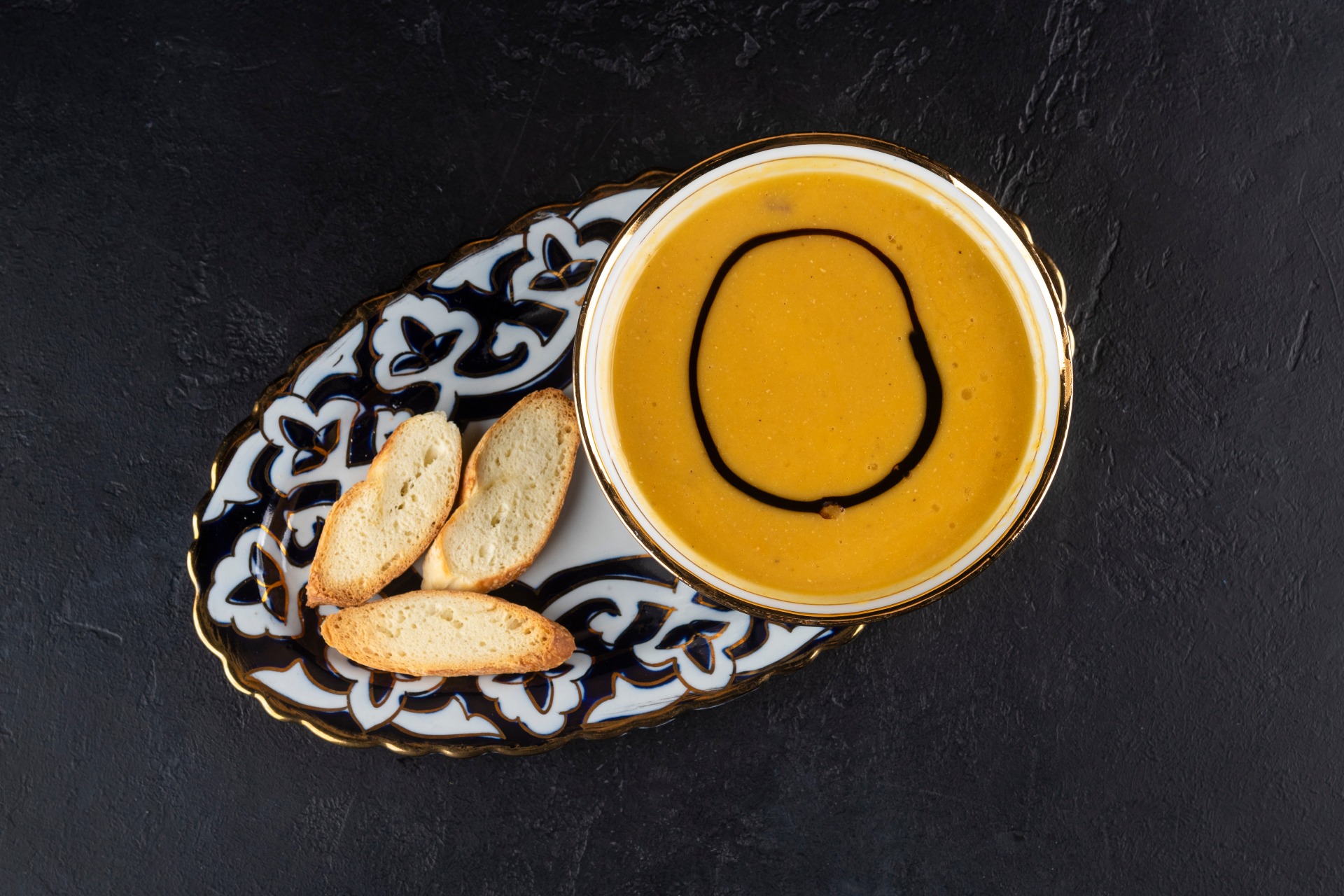Густой сытный суп-пюре с овощами, чечевицей и мясом телятины. Подается с долькой лимона и хрустящими гренками.