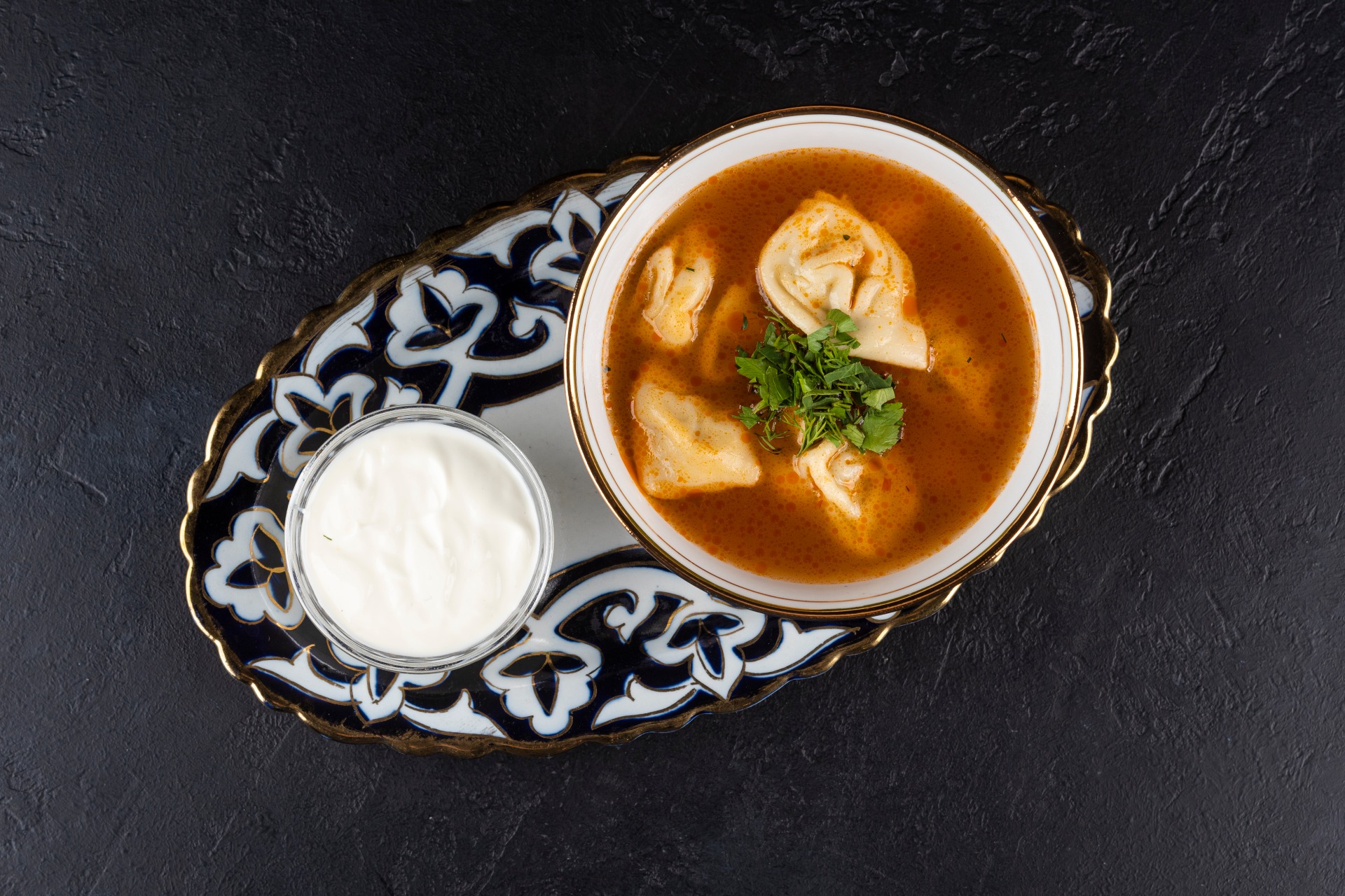 Пельмешки ручной лепки с начинкой из баранины и лука в бульоне с пассерованными морковью и луком. Посыпается ароматной зеленью и подается со сметаной.