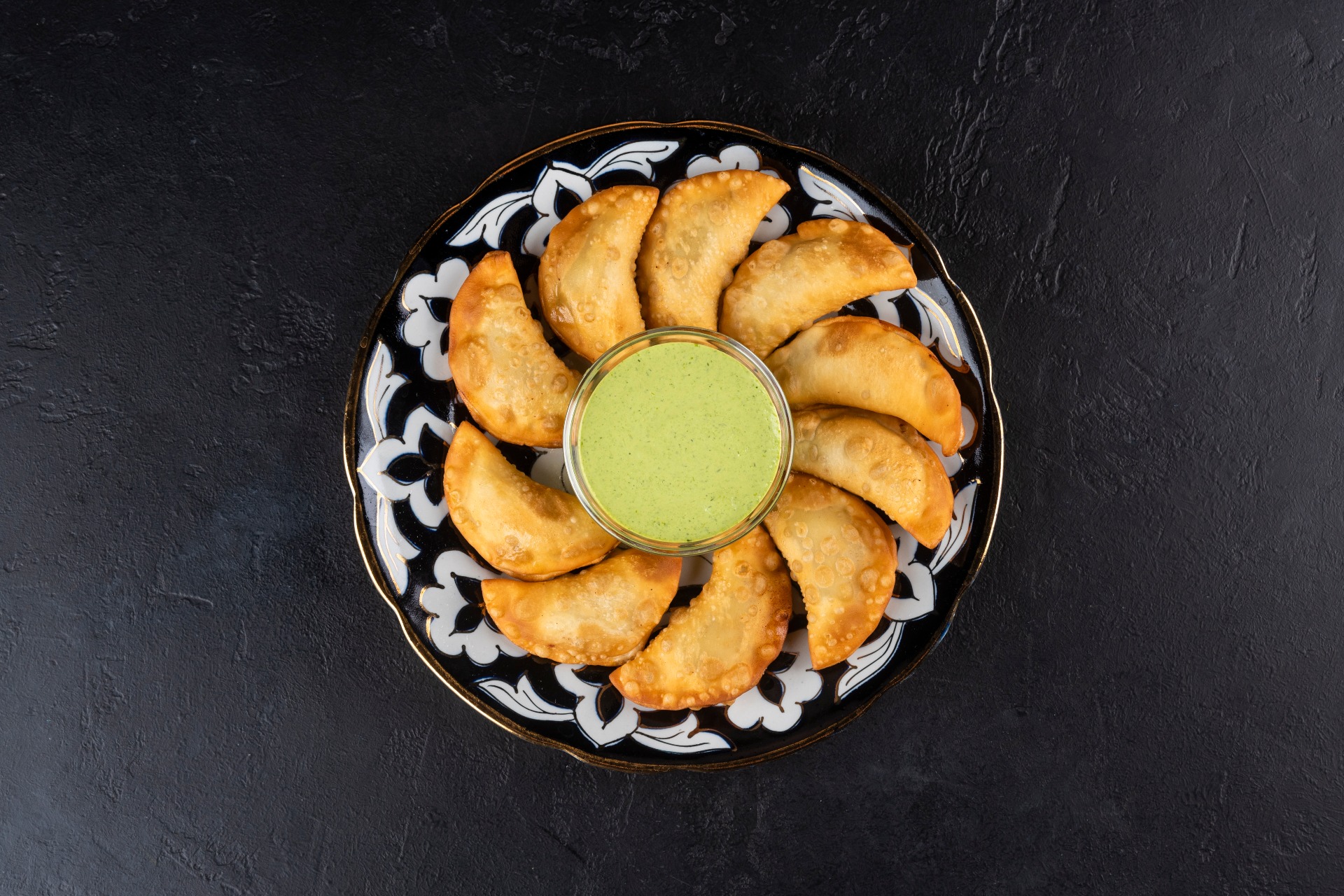 Маленькие чебуречки ручной лепки, обжаренные во фритюре до хрустящей корочки с начинкой из нежной телятины и сочной зелени. Подаются с соусом Цахтоне.