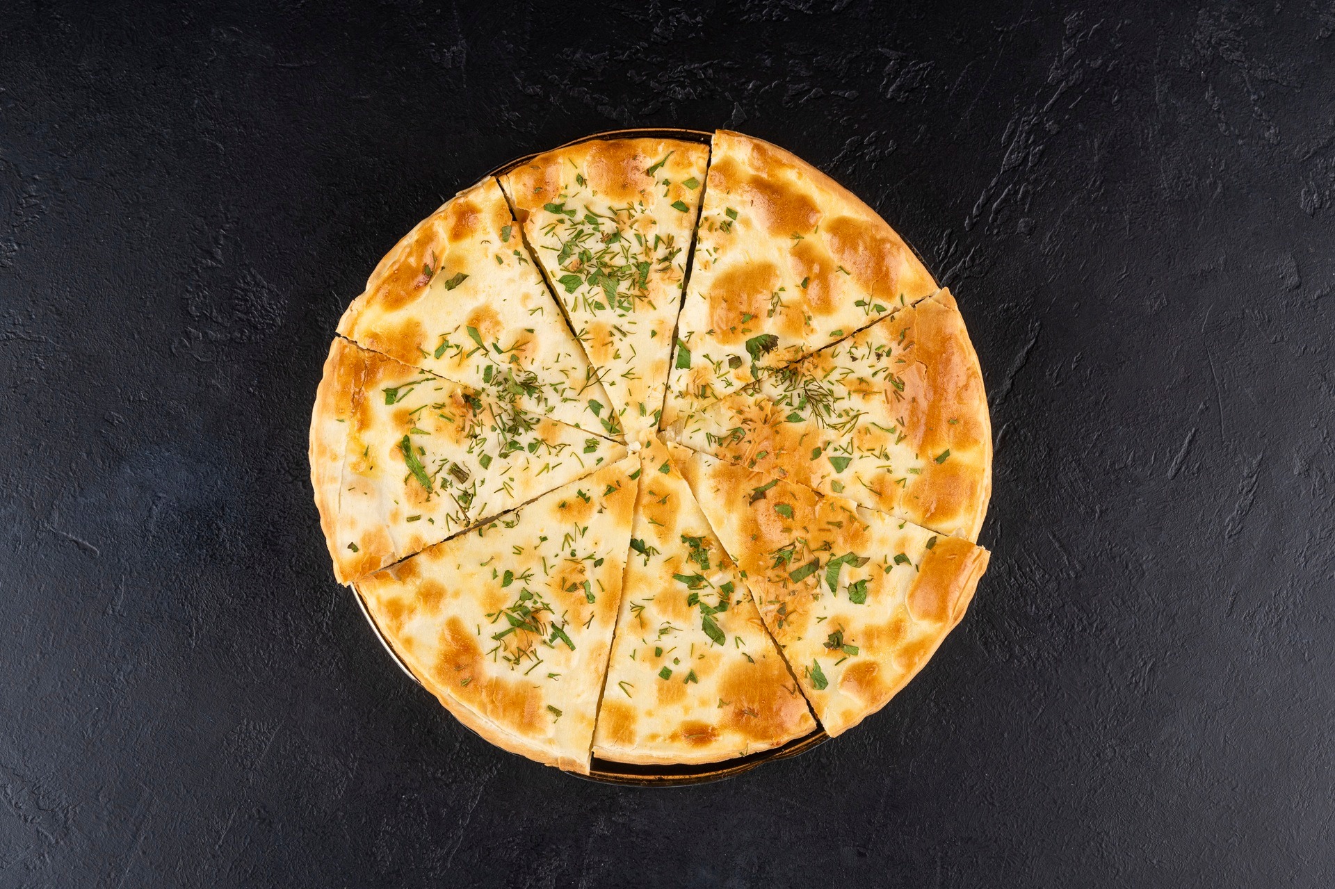 Тонкая восточная лепешка с начинкой из сыра Сулугуни, посыпается зеленью.