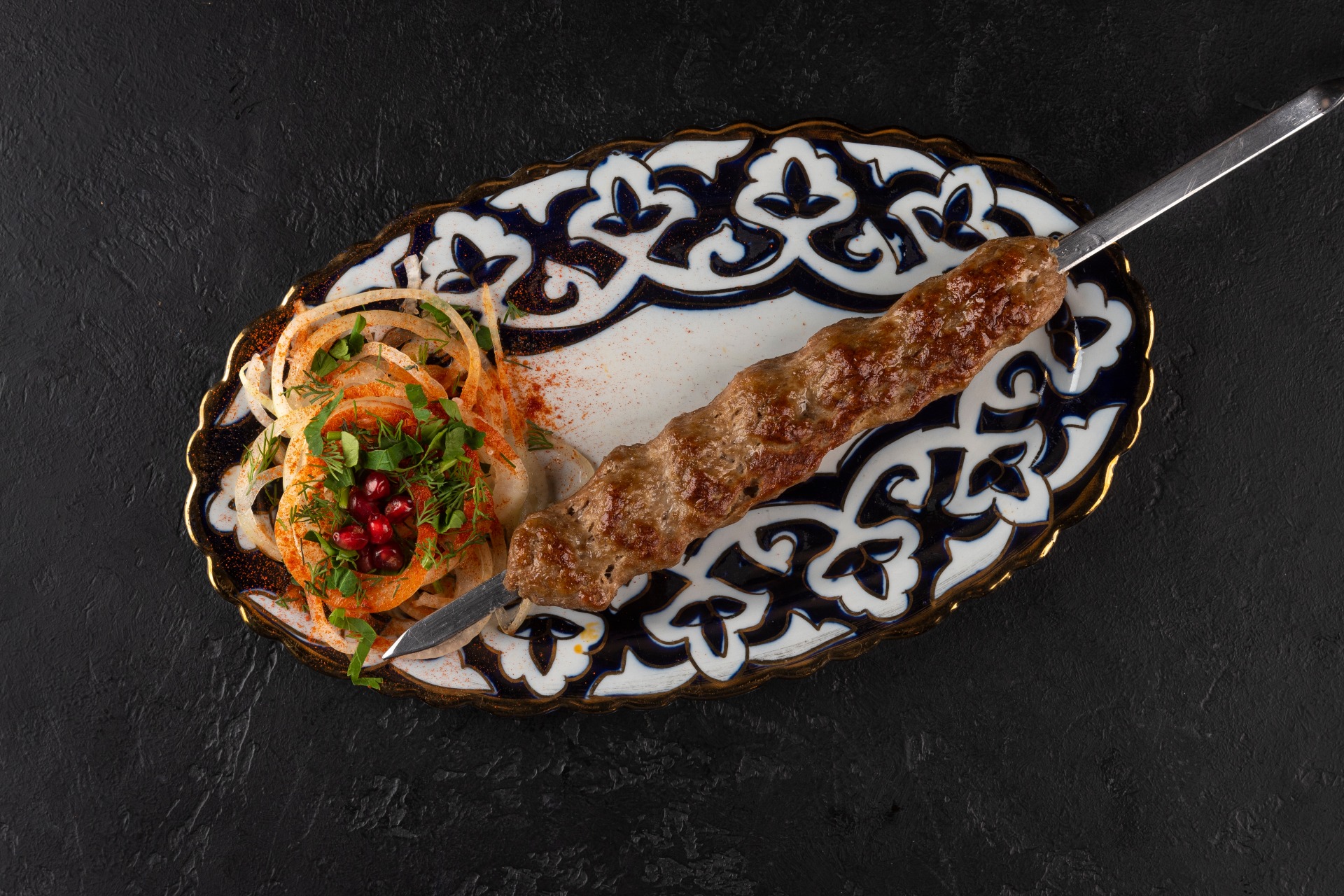 碎羊肉、库尔杜克香肠和洋葱制成的烤串。配以腌洋葱、石榴和香草。