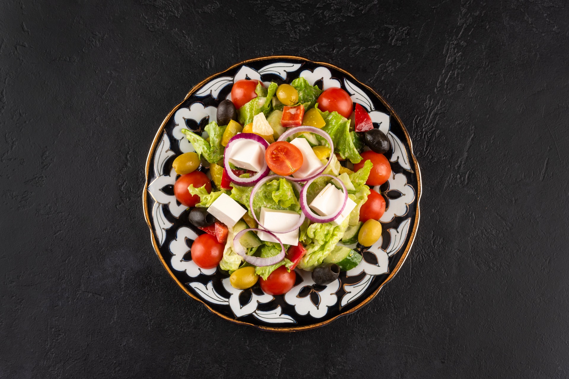 经典沙拉的创意演绎:多汁的樱桃番茄、酥脆的新鲜黄瓜和甜椒与柔软的菲达奶酪相结合。冰山生菜和罗拉生菜的叶子增添轻盈和口感,而橄榄、黑橄榄和红洋葱则提供浓郁的风味点缀。