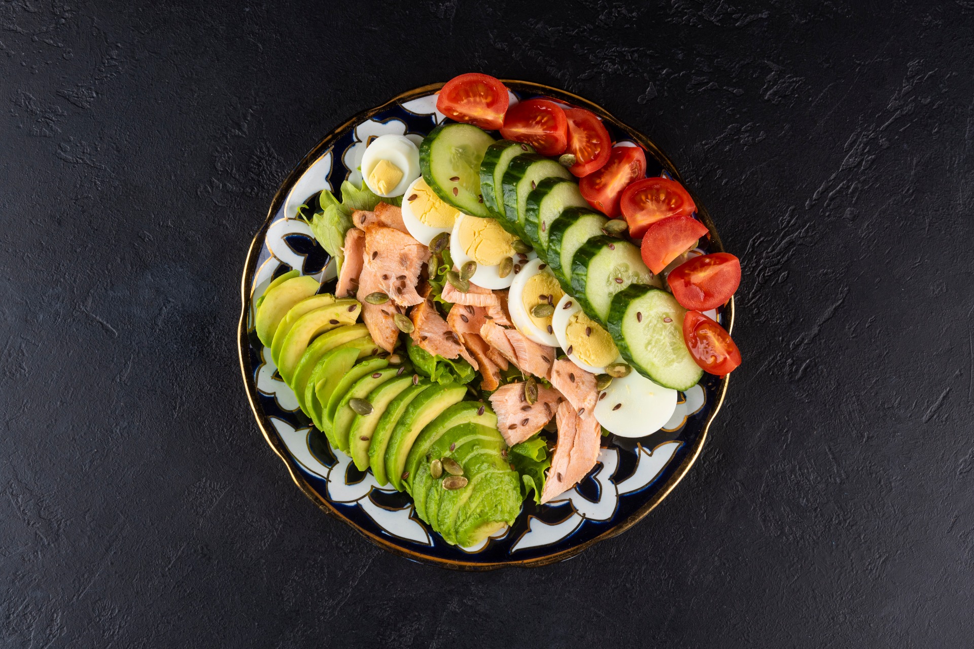 新鲜的沙拉,由成熟的鳄梨、多汁的樱桃番茄、煮熟的鸡蛋、冰山生菜和罗拉叶、黄瓜以及烤制的三文鱼组成。调味以柠檬汁,并撒上亚麻籽和南瓜子。