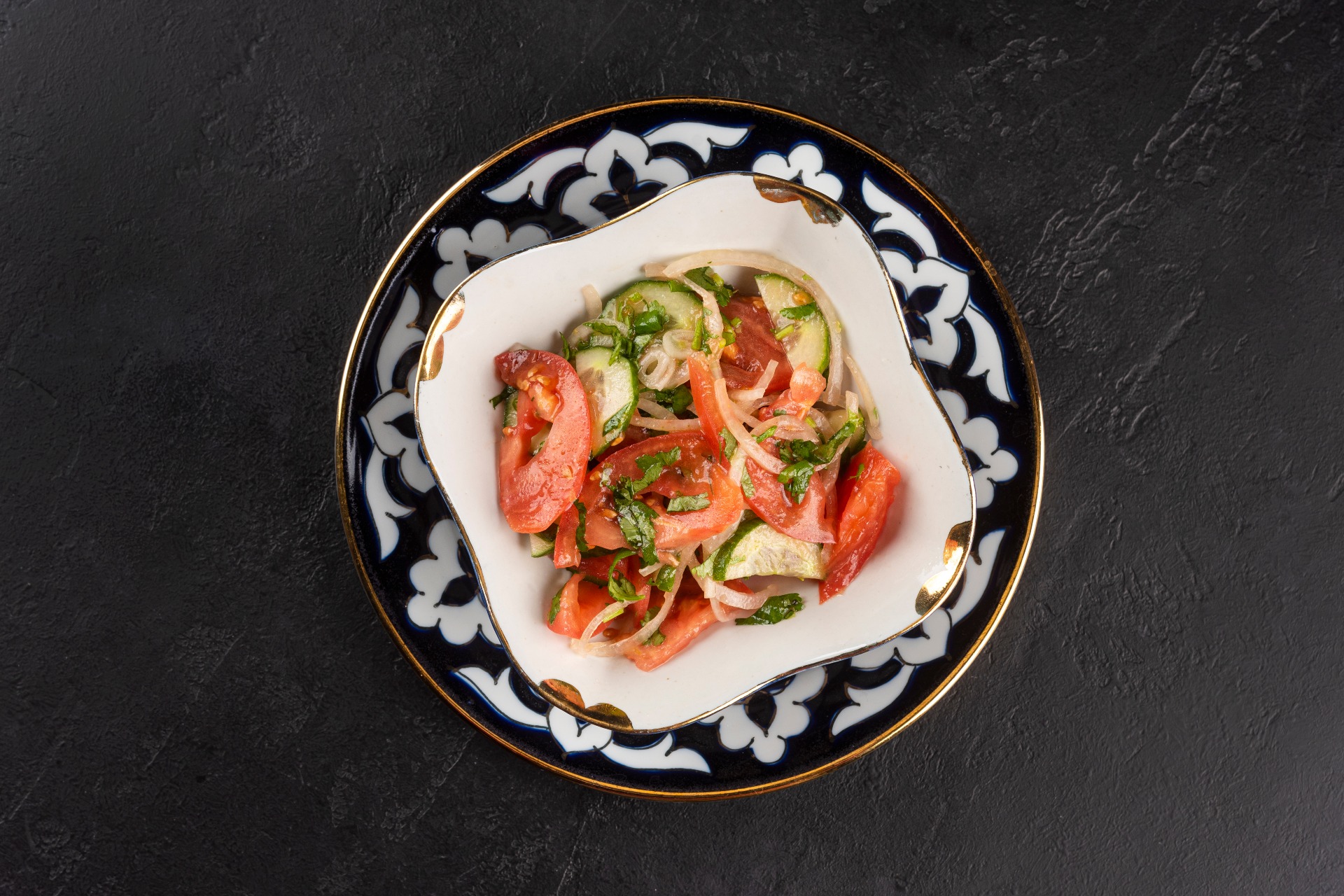 清爽的沙拉,由成熟多汁的番茄和脆爽的黄瓜组成,配以细切的洋葱和芳香的香菜。