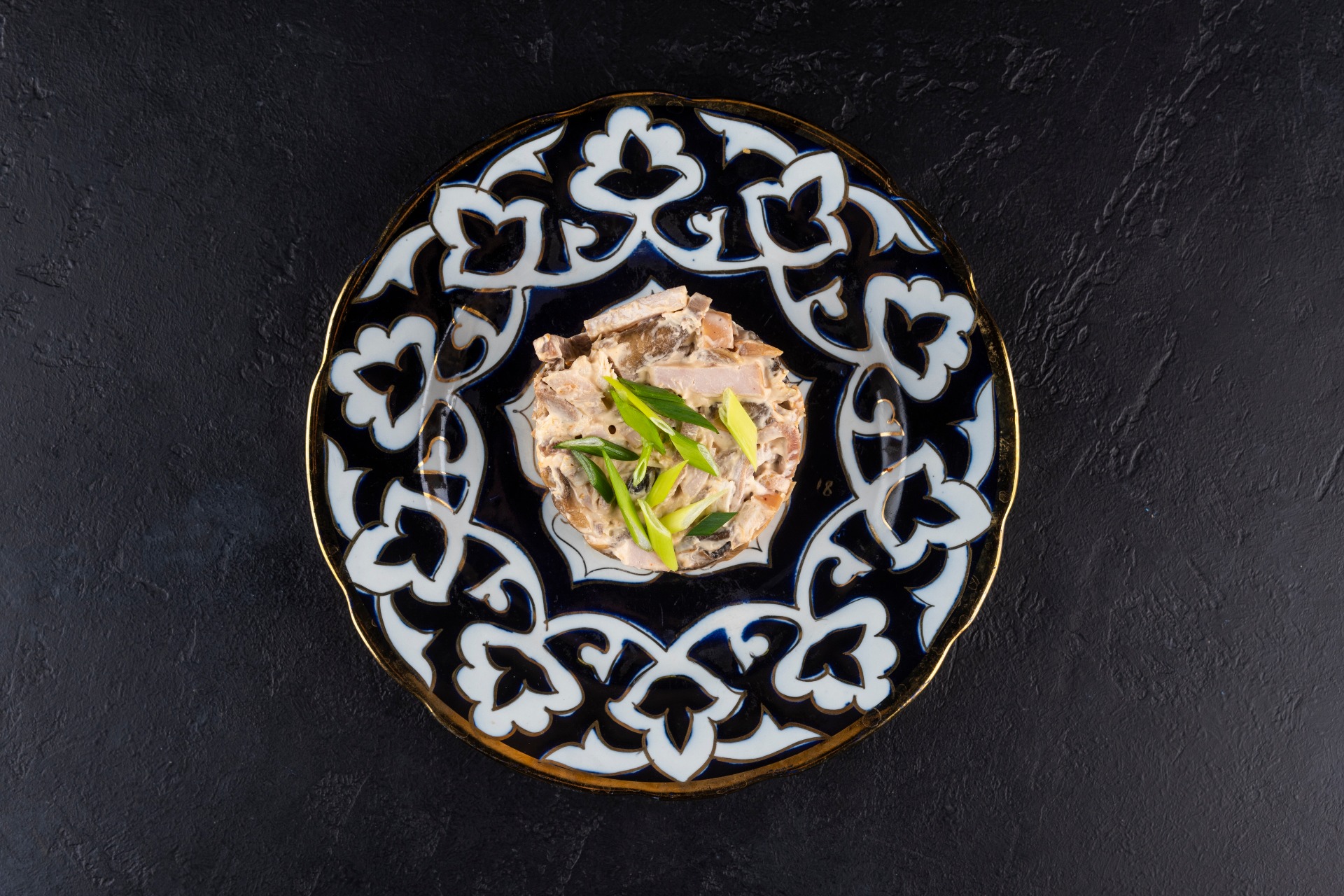 丰盛的沙拉由煮牛舌、鸡胸肉、熏鸡和炒蘑菇制成。用自制的酸奶油蛋黄酱调味,并以葱花装饰。