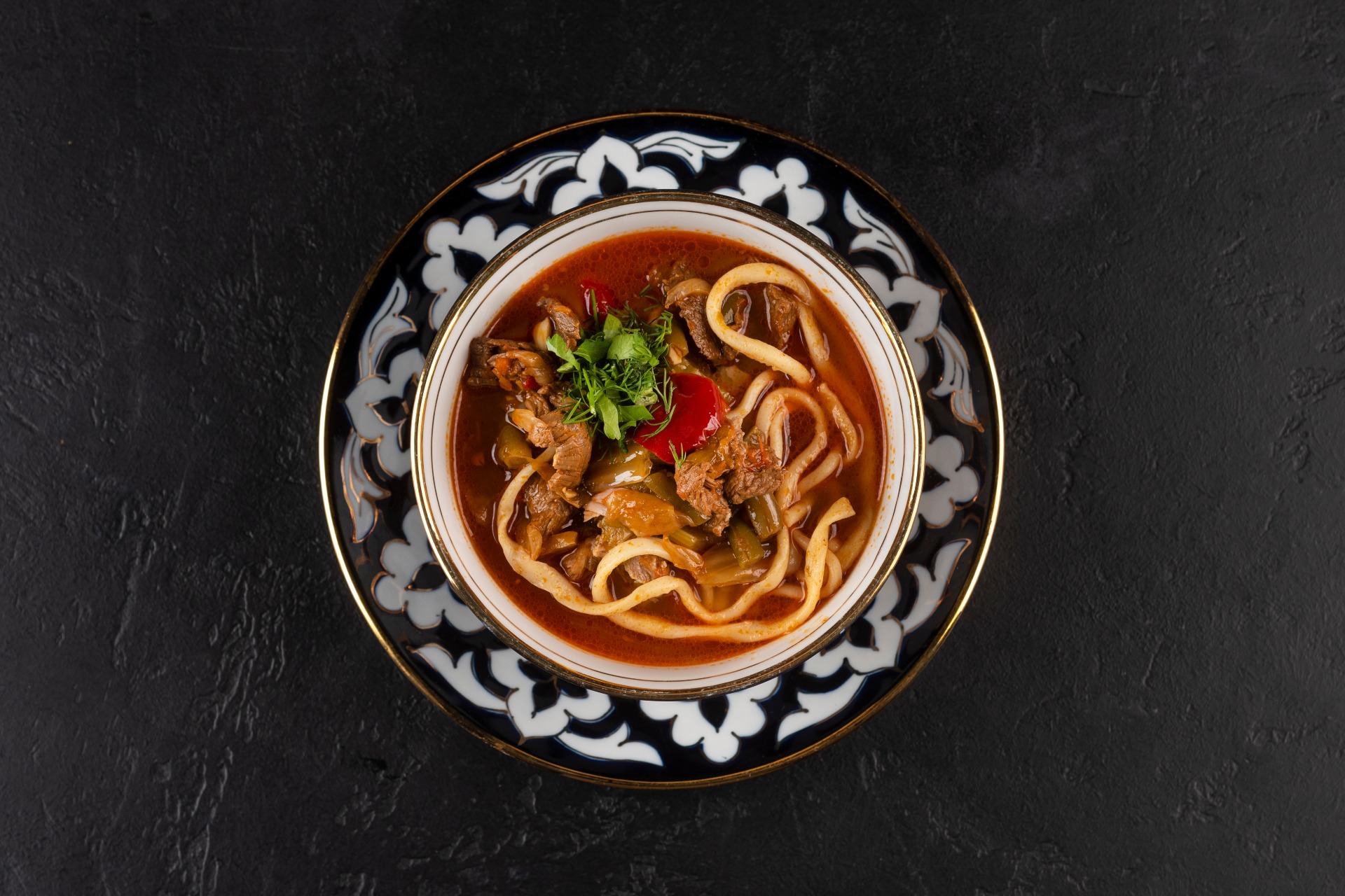 传统的乌兹别克羊肉蔬菜汤,蔬菜在锅中翻炒,加入手工拉面的面条。撒上芳香的香草。