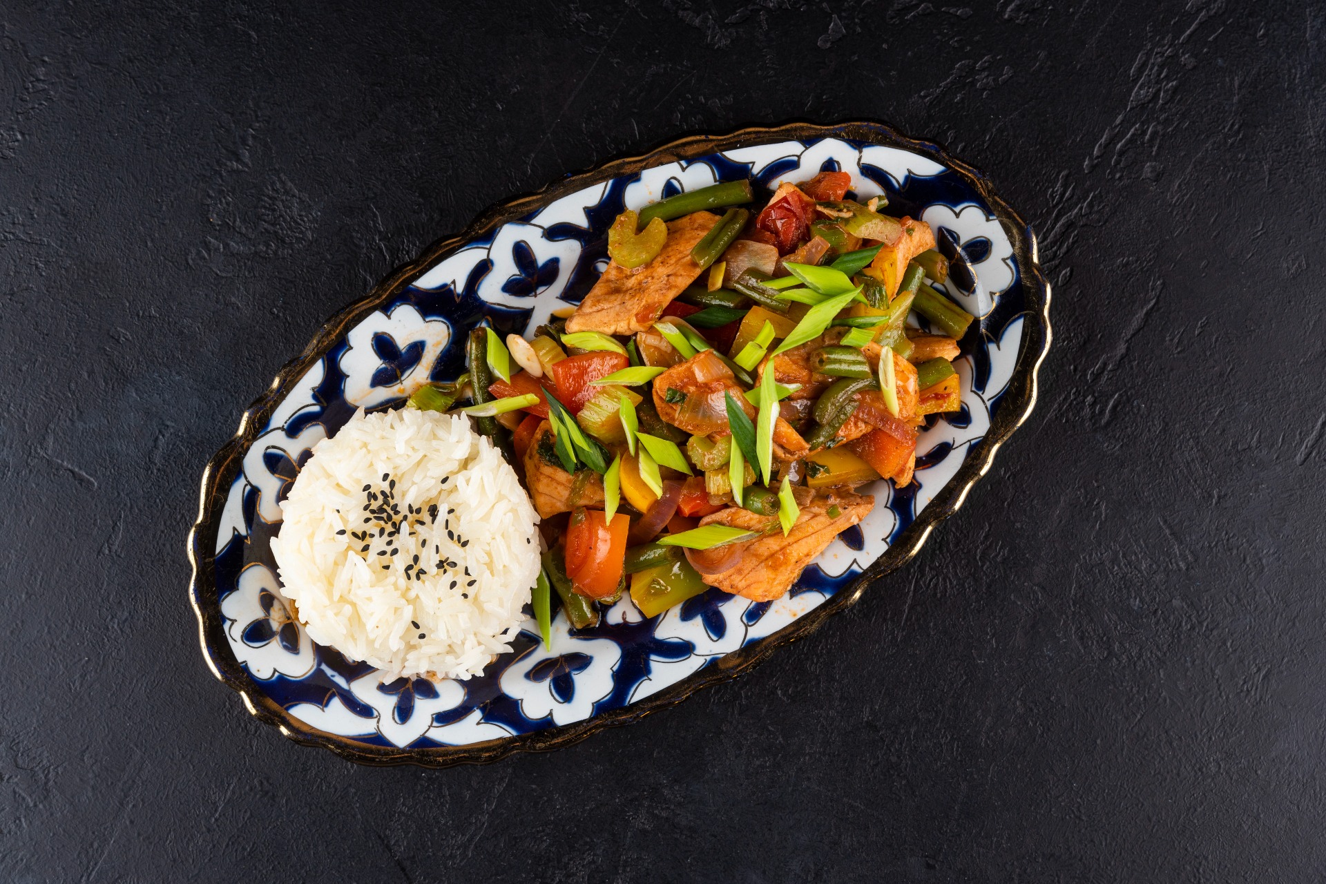 传统的乌兹别克菜肴,由嫩三文鱼与番茄、甜椒、红洋葱、青豆和大蒜在番茄酱中炒制而成。菜肴点缀绿葱,并配米饭食用。